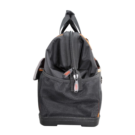 This tool bag has a stay-open top for unobstructed tool accessTool organizer’s orange interior and wider opening makes it easier to find the right toolLarge interior zipper pocketInside is equipped with various sized pockets for tools and gearMultiple exterior front and back pockets for quick accessOutside has side mesh pockets and a metal tape measure holder1680d ballistic weave for durabilityShoulder strap with extra padding and handlesFully-molded bottom protects from the elements