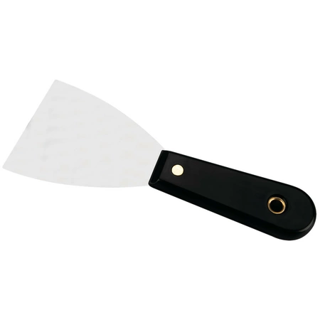 Polished stainless steel putty knife with a riveted handle. Convenient hang hole.