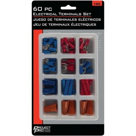 60-piece electrical terminals set that includes spade, butt, flat and wire nut terminals. Comes with a storage tray.