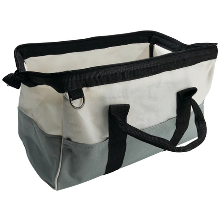 Store tools and accessories in this wide-mouth tool bag made from durable nylon. Features external pockets for added storage.