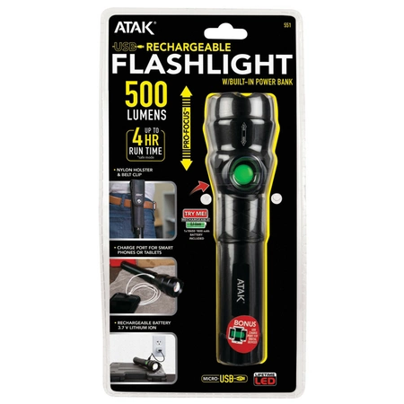 500-lumen rechargeable flashlight featuring a Cree LED and a variety of lighting functions, including a safe mode and a USB charging port for smart devices.