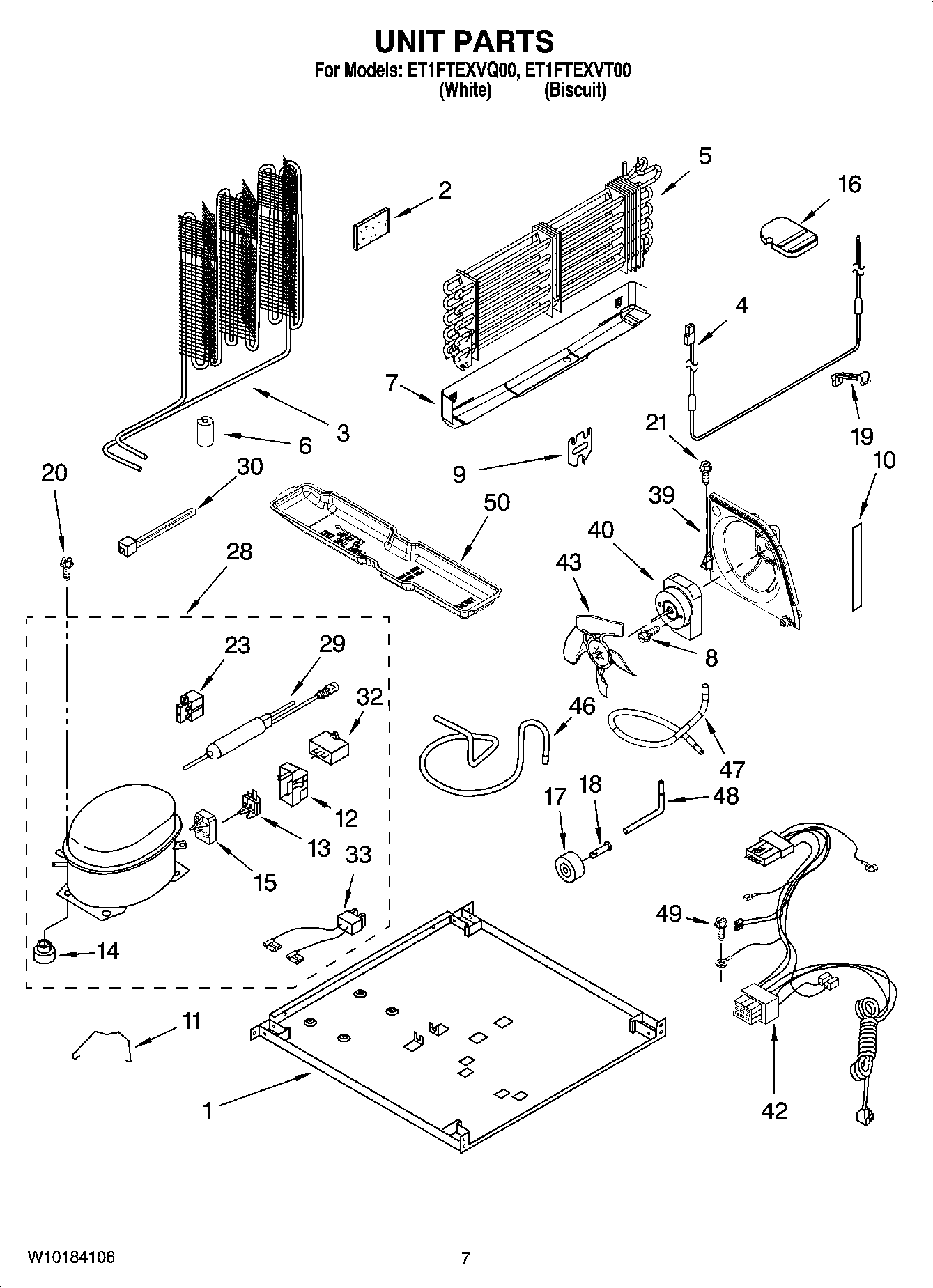 ET1FTEXVQ00 04 – UNIT PARTSadmin2025-04-26T11:09:20+00:00ET1FTEXVQ00 04 – UNIT PARTS ProductsPositionProductVALVE, ACCESS (1/2``)WP978025 Whirlpool Refrigerator Valve978030 Whirlpool Refrigerator Valve978027 Whirlpool Refrigerator Primary Valve978026 Whirlpool Refrigerator Primary Valve876764 Whirlpool Refrigerator Primary ValveREFRIGERANT CHARGE 4.00 Ozs. (R134A)Following Parts Not Illustrated and Optional Parts Not IncludedVALVE, ACCESS (5/8``)1Plate, Unit Mounting2W11553819 Whirlpool Refrigerator Insulation3WP2214960 Whirlpool Refrigerator Condenser4WPW10140847 Whirlpool Refrigerator Heater5EVAPORATOR ASSY.6W10852725 Whirlpool Refrigerator Grommet7Drain Pan8WPW10171469 Whirlpool Refrigerator Screw9Bracket, Heater10Extension, Air Baffle112223314 Whirlpool Refrigerator Clip12WP2162358 Whirlpool Refrigerator Terminal Cover13WP2214067 Whirlpool Refrigerator Overload Relay14Grommet (4) (Service)14876811 Whirlpool Grommet15WPW10197426 Whirlpool Refrigerator Start Device16Support Block17WPW10475495 Whirlpool Roller Assembly18W11594405 Whirlpool Axle19Clip, Heater213400518 Whirlpool Oven Foot Mount Screw23W10920279 Whirlpool Refrigerator Start Relay28W10309988 Whirlpool Refrigerator Compressor29W10843121 Whirlpool Refrigerator Tube29WPW10143759 Whirlpool Dryer Filter30WPW10339879 Whirlpool Wire Tie32WPW10662129 Whirlpool Refrigerator Run Capacitor33WP2172890 Whirlpool Refrigerator Wire39WP2315541 Whirlpool Refrigerator Air Baffle40WP2188874 Whirlpool Refrigerator Condenser Motor422187382 Whirlpool Refrigerator Wire Harness43W11458267 Whirlpool Refrigerator Fan Blade46Tube, Discharge472214924 Whirlpool Refrigerator Tube482154109 Whirlpool Refrigerator Tube49WP489128 Whirlpool Refrigerator Screw50WP2254574 Whirlpool Refrigerator Evaporator Tray