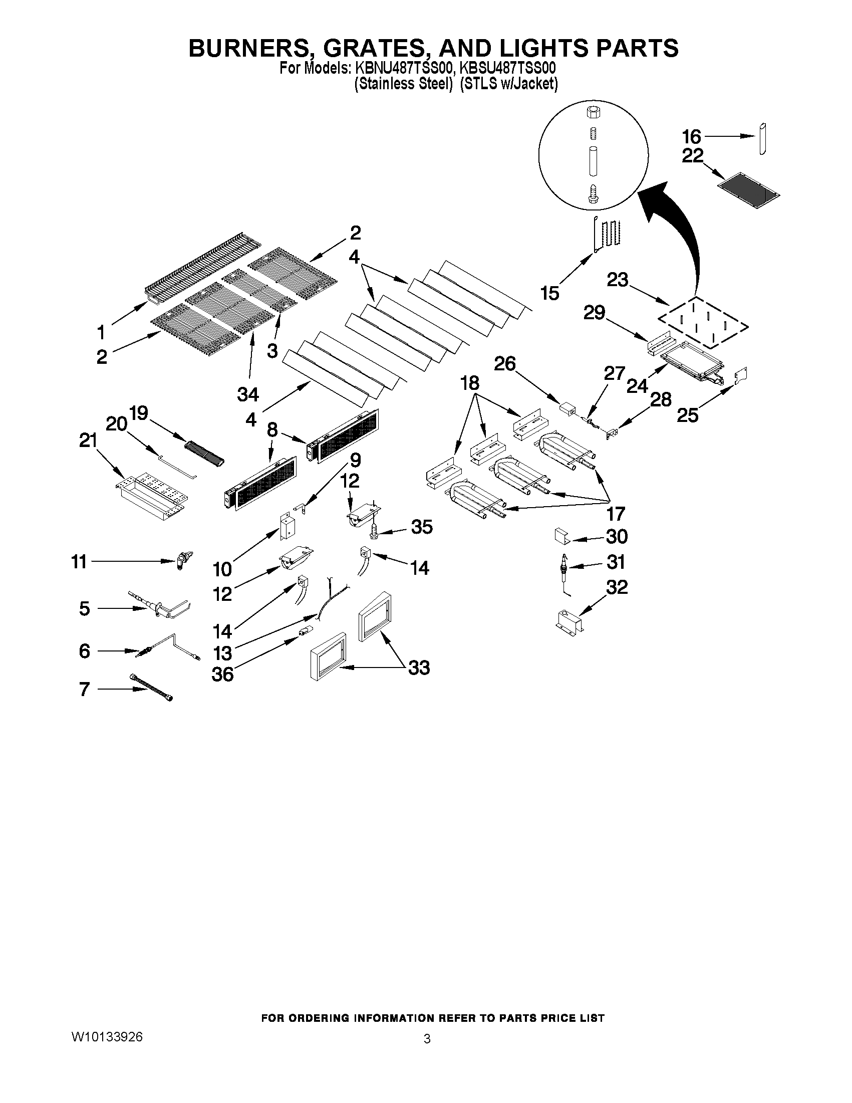 KBSU487TSS00 02 – BURNERS, GRATES, AND LIGHTS PARTS