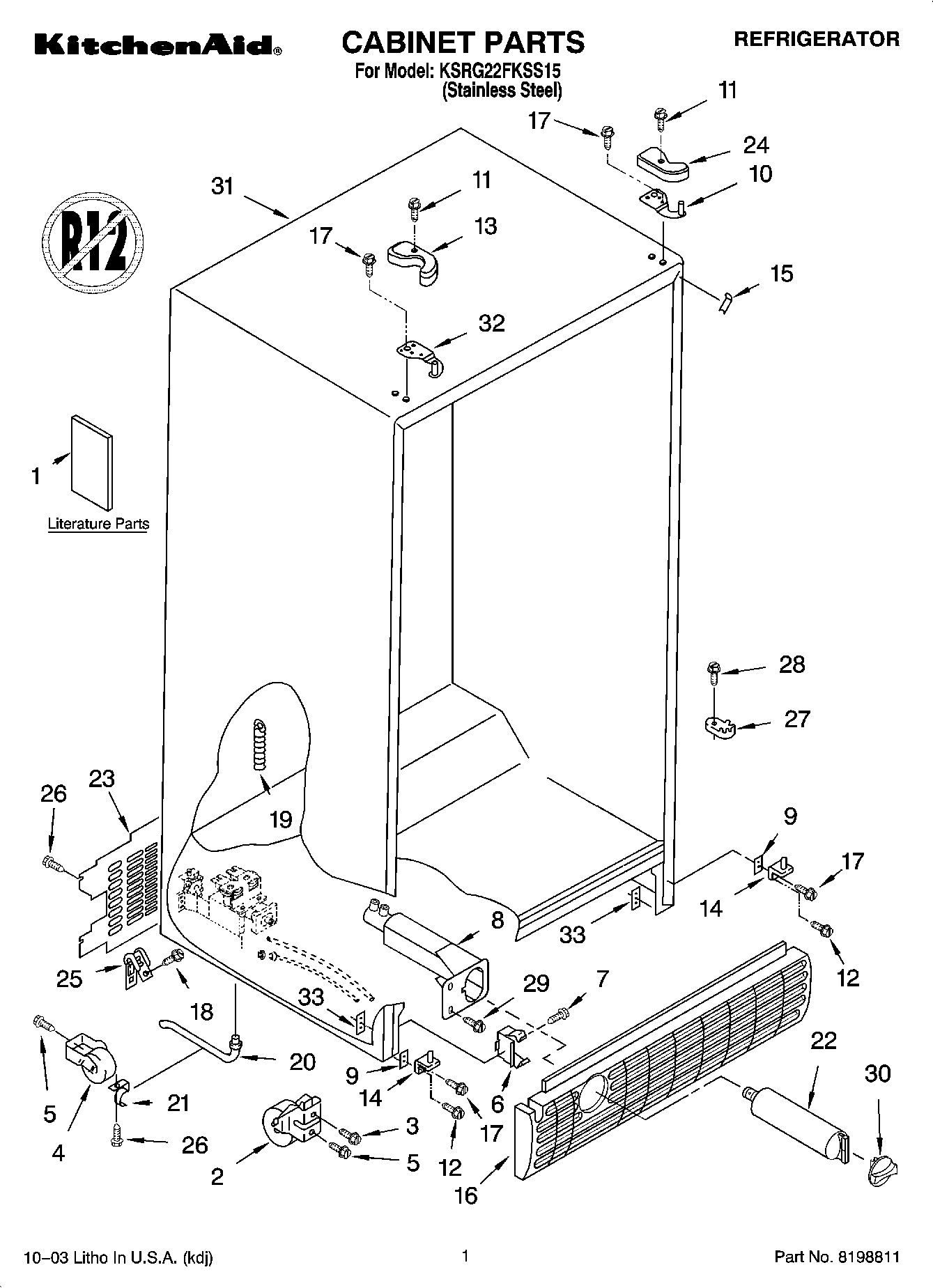 KSRG22FKSS15 01 – CABINET PARTSadmin2025-04-26T12:22:14+00:00KSRG22FKSS15 01 – CABINET PARTS ProductsPositionProduct1LITERATURE PARTS (Service & Wiring Sheet)1LITERATURE PARTS (Energy Label)1Literature Parts (Use & Care Guide)1Modular Icemaker Service Sheet2Front Roller (2)3W10850698 Whirlpool Refrigerator Screw4WPW10250570 Whirlpool Refrigerator Cabinet Roller5WP489427 Whirlpool Refrigerator Screw6WP2155013 Whirlpool Refrigerator Clip7WP489478 Whirlpool Refrigerator Screw8WP2186443 Whirlpool Water Filter Housing9WP2209697 Whirlpool Refrigerator Shim10WP2203771 Whirlpool Refrigerator Door Hinge11WP8281227 Whirlpool Screw12W10856122 Whirlpool Refrigerator Screw13WP2203407B Whirlpool Refrigerator Cover148201707 Whirlpool Door Hinge15Filler, Wrapper (Black)16W10802713 Whirlpool Refrigerator Grille17WP489497 Whirlpool Screw18WP489464 Whirlpool Refrigerator Screw19W11566763 Whirlpool Fitting20WP1108438 Whirlpool Refrigerator Extension21WP1108439 Whirlpool Refrigerator Clip22EDR5RXD1 Whirlpool Refrigerator Ice and Water Filter 5 (Pink)23WP2188756 Whirlpool Refrigerator Unit Cover24WP2203408B Whirlpool Refrigerator Cover25549193 Whirlpool Refrigerator Power Clamp27WPW10329686 Whirlpool Door Cam Black28WP489483 Whirlpool Screw29WP489500 Whirlpool Refrigerator Screw30WP2186494B Whirlpool Refrigerator Filter Cap31Cabinet (Not A Serviceable Part)32WP2203770 Whirlpool Refrigerator Door Hinge33WP2304249 Whirlpool Refrigerator Plate