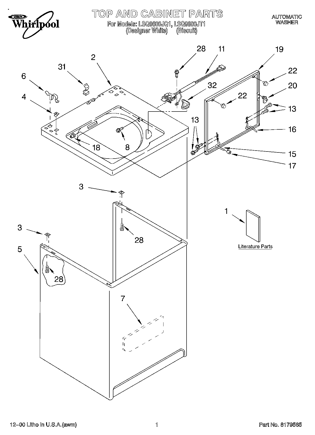 LSQ9600JT1 01 – TOP AND CABINET, LITERATUREadmin2025-04-26T11:15:02+00:00LSQ9600JT1 01 – TOP AND CABINET, LITERATURE ProductsPositionProductManual, (Washer) Do-It-Yourself1Literature Parts (Installation Instructions) (French)1Literature Parts (Installation Instructions) (English)1LITERATURE PARTS1Literature Parts (Use & Care Guide) (French)1Literature Parts (Use & Care Guide) (Energy Guide)1Literature Parts (Use & Care Guide) (English)1Literature Parts (Use & Care Guide) (Wiring Diagram)2Top (White)2Top (Biscuit)3WP62750 Whirlpool Spacer4WP357213 Whirlpool Hinge Stopper563424 Whirlpool Cabinet Assembly5Cabinet (Biscuit)6WP62780 Whirlpool Cabinet Clip7Cabinet-Sound Damper8WP3356311 Whirlpool Screw113949247V Whirlpool Washer Lid Switch Assembly13SCREW15WP54584 Whirlpool Hinge16WP91770 Whirlpool Hinge17Bumper, Lid Hinge18WP21258 Whirlpool Washer Lid Hinge Bearing19Lid19Lid (Biscuit)20WP358684 Whirlpool Strike Assembly22WP9724509 Whirlpool Bumper28WP3390631 Whirlpool Screw31WP90016 Whirlpool Clip32WP3362952 Whirlpool Bezel