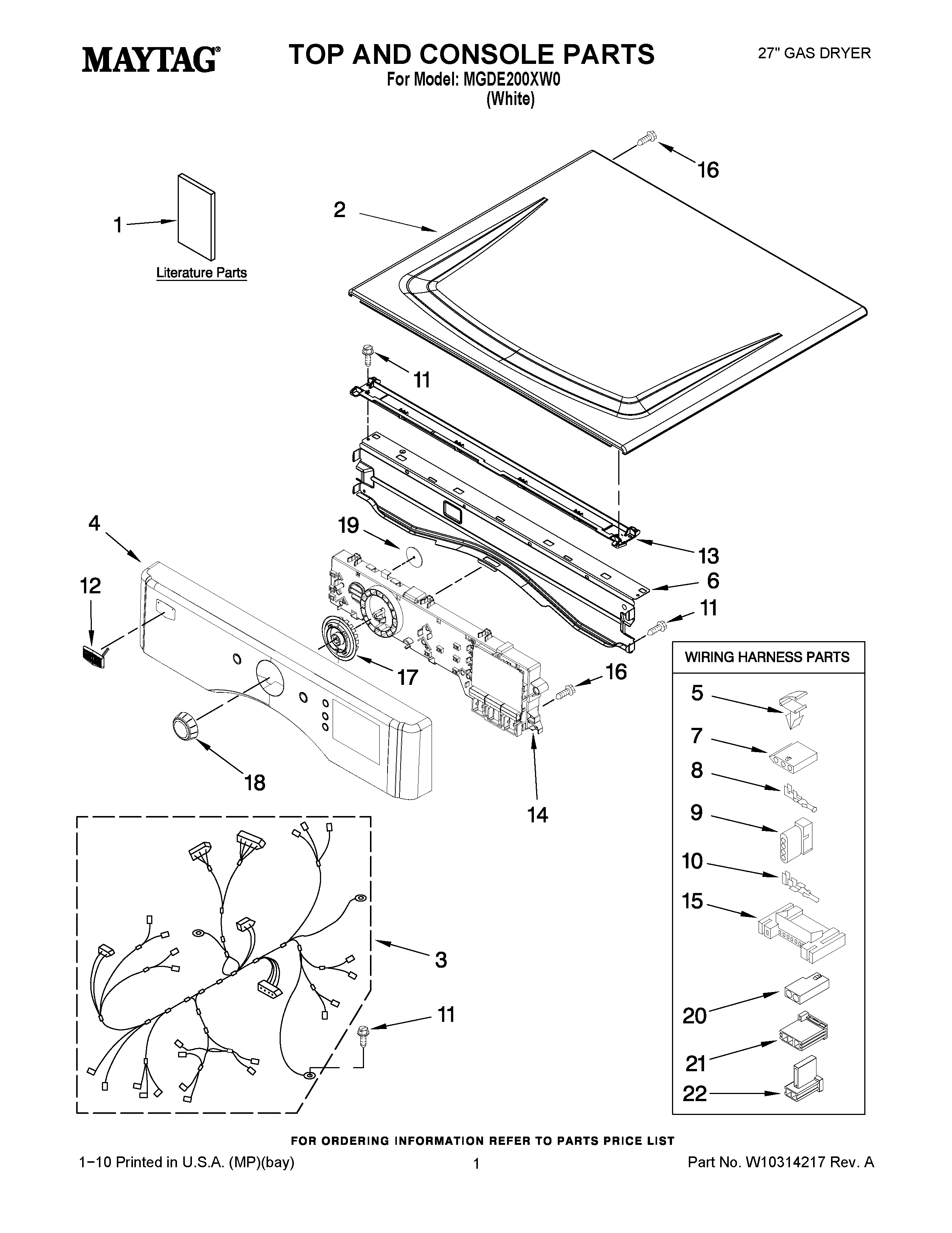 MGDE200XW0 01 – TOP AND CONSOLE PARTS